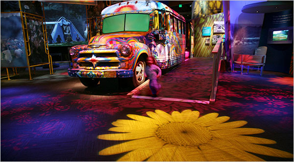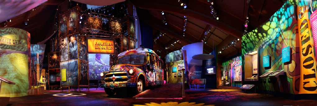 The museum serves as a metaphor for the change that has taken place among us. Were the communal, pilgrim community of mostly gate crashers and their meager possessions once camped in chaos there stands a well synchronized, state-of-the-arts techno-experience. The 6,728 square-foot permanent exhibit gallery contains more than two thousand music, film, and photographic elements including twenty short films, panels and murals containing 330 photographs, and at least 300 artifacts.